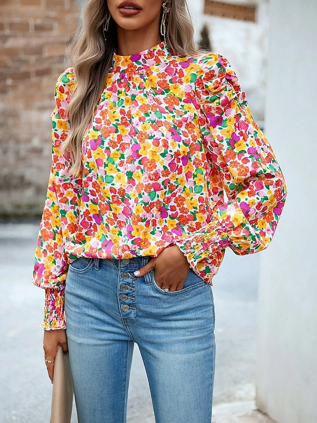 Women’s Bandeau Blouse Peplum Black White Pink Snowflake Feather Bull Sequins Embroidered Quarter Zip Long Sleeve Work Casual Sports Vacation Tunic Gothic Lolita Standing Collar Slim Floral Butterfly