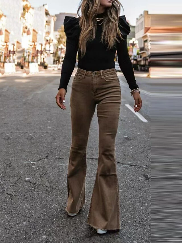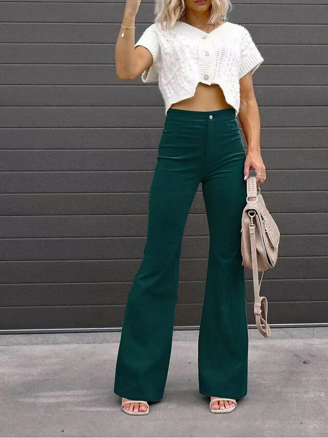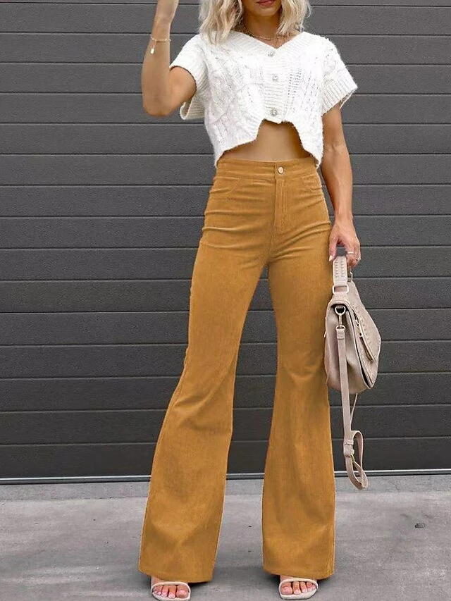Women’s Bell Bottom Pants Maillard Trousers Full Length Corduroy Pocket Micro-elastic High Waist Fashion Streetwear Party Street Wine Grey S M Fall Winter