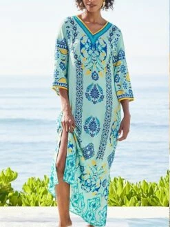 Women’s Casual Dress Boho Dress Print Dress Floral Split Print V Neck Long Dress Maxi Dress Active Fashion Outdoor Street 3/4 Length Sleeve Loose Fit Blue Summer Spring S M L XL XXL
