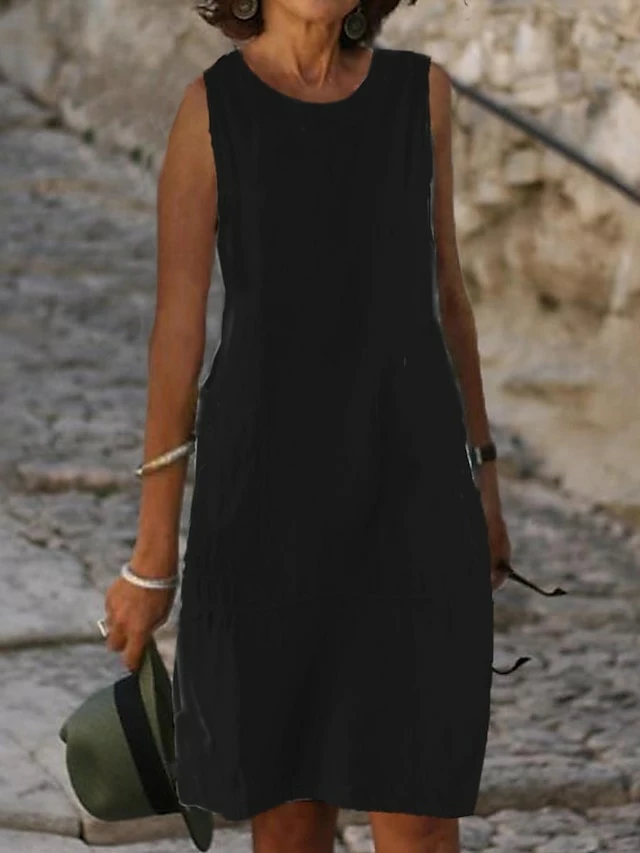 Women’s Casual Dress Cotton Dress Shift Dress Midi Dress Cotton Blend Fashion Basic Outdoor Daily Vacation U Neck Pocket Sleeveless Summer Spring Fall 2023 Loose Fit Light Blue Black White Plain S M