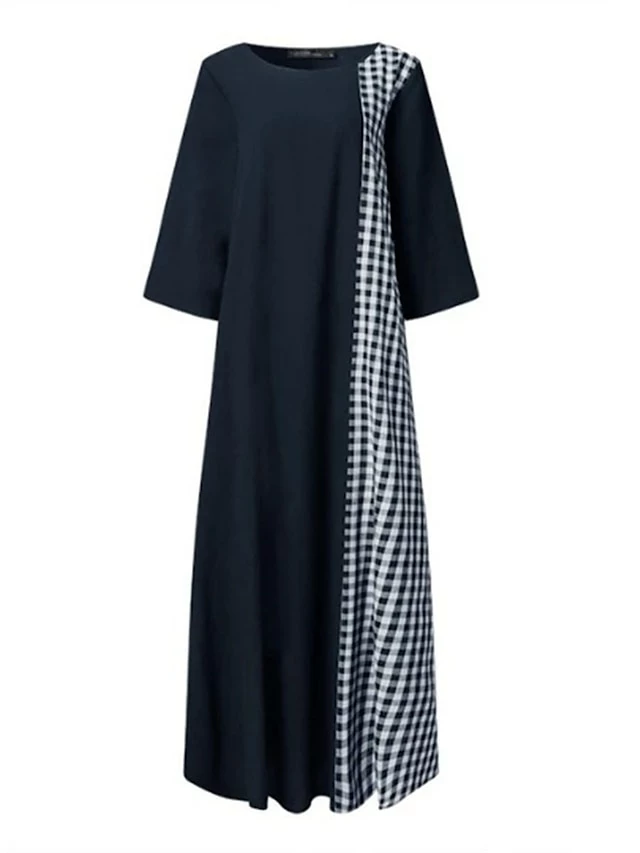 Women’s Casual Dress Cotton Linen Dress A Line Dress Maxi Long Dress Cotton Blend Casual Outdoor Daily Crew Neck Print 3/4 Length Sleeve Summer Spring 2023 Loose Fit Black Red Navy Blue Plaid M L XL