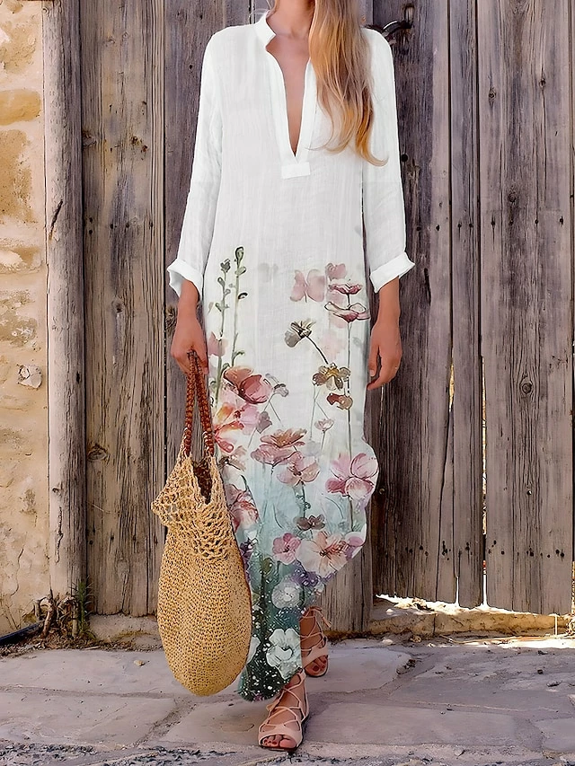 Women’s Casual Dress Cotton Linen Dress Maxi Long Dress Polyester Fashion Casual Daily Outdoor Daily Vacation Split Neck Split Print Long Sleeve Summer Spring Fall 2023 Loose Fit White Pink Navy Blue