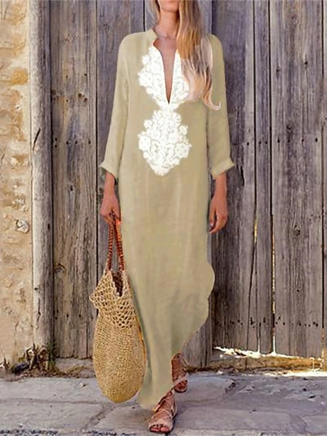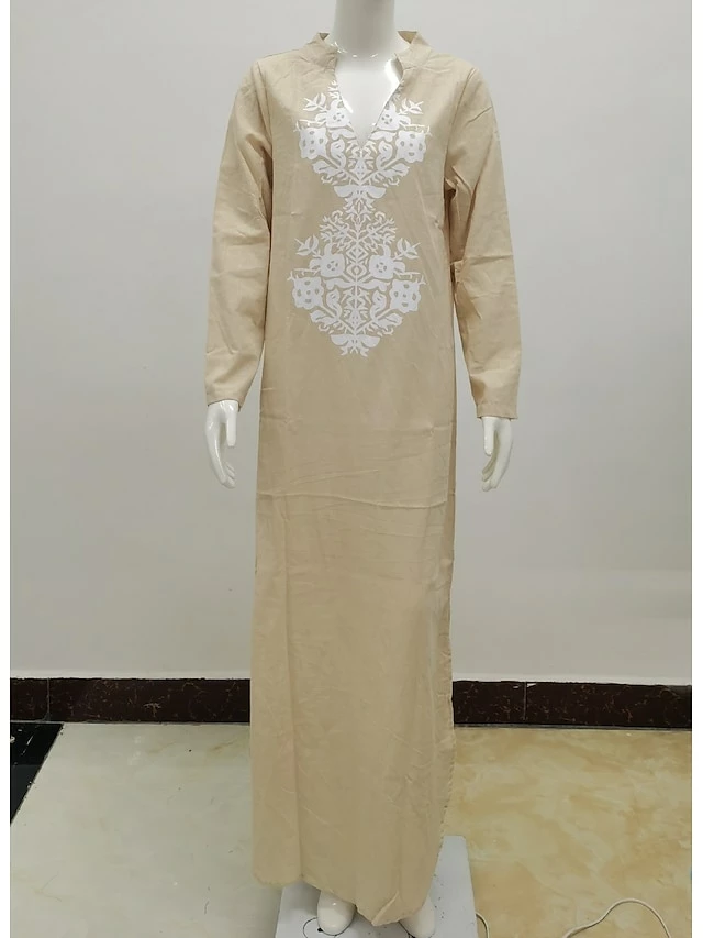 Women’s Casual Dress Cotton Linen Dress Shift Dress Maxi Long Dress Cotton Blend Basic Casual Outdoor Daily Vacation V Neck Print Long Sleeve Summer Spring Fall 2023 Loose Fit Yellow Sky Blue Khaki