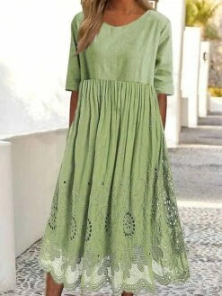 Women’s Casual Dress Cotton Linen Dress Swing Dress Midi Dress Cotton Blend Fashion Modern Outdoor Daily Crew Neck Lace Patchwork Half Sleeve Summer Spring Fall 2023 Loose Fit Green Plain S M L XL 2XL
