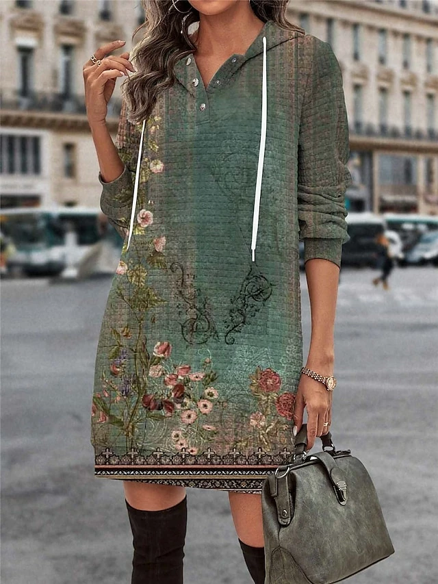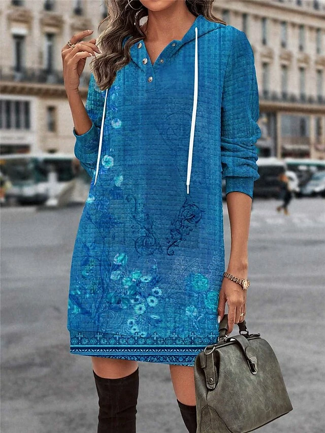 Women’s Casual Dress Hoodie Dress Mini Dress Warm Fashion Outdoor Vacation Going Out Hoodie Pocket Print Floral Regular Fit Blue Purple Green S M L XL XXL