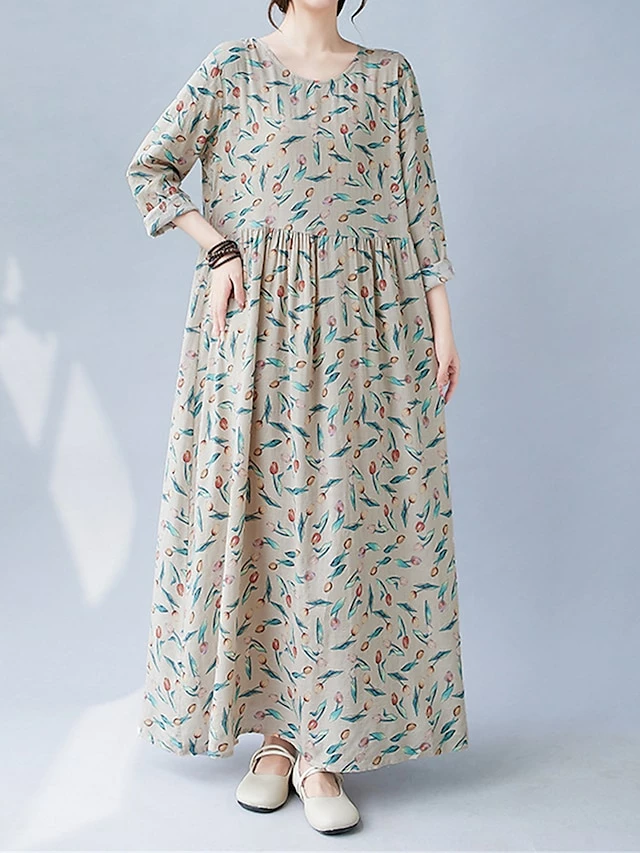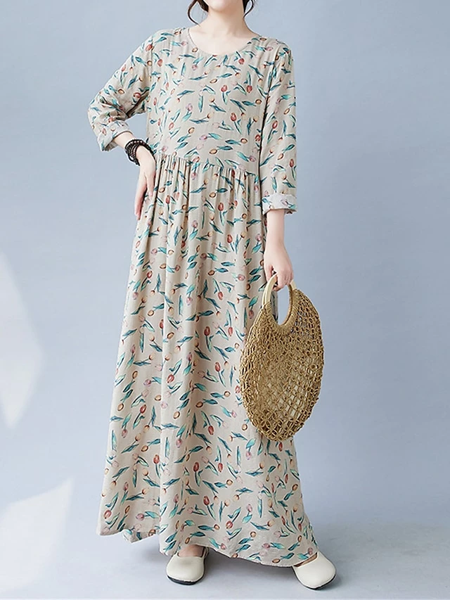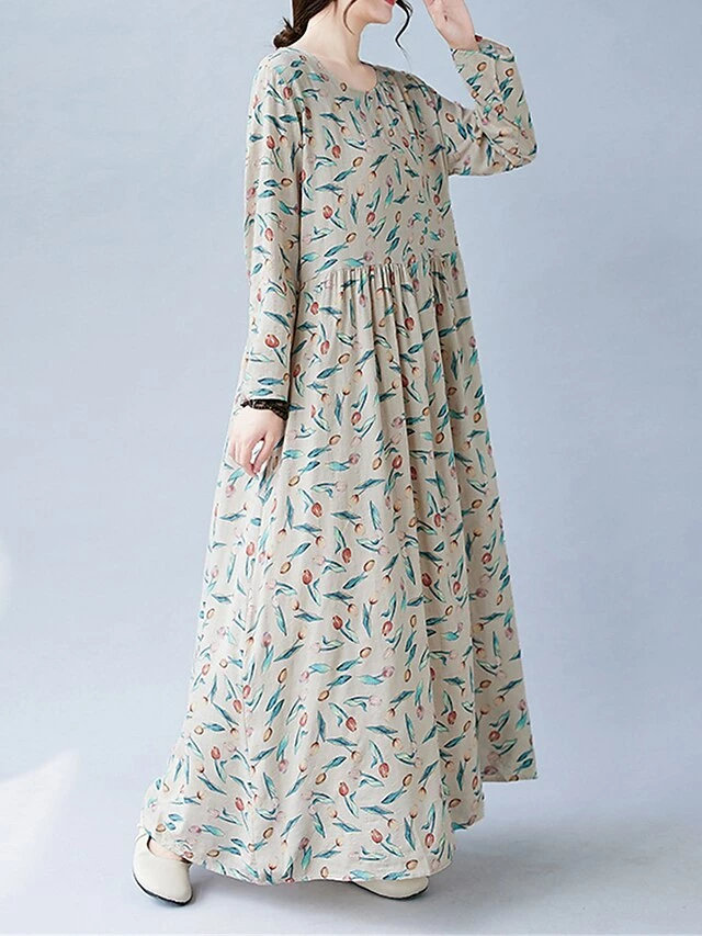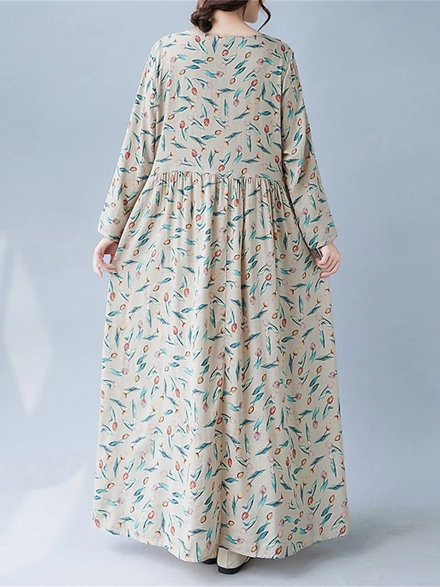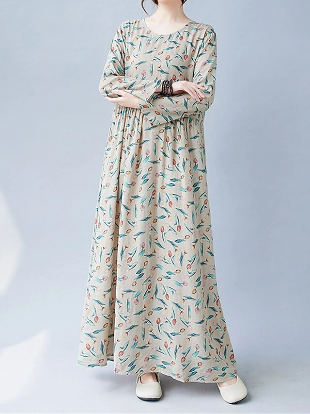 Women’s Casual Dress Linen Dress Swing Dress Maxi Long Dress Linen Fashion Modern Outdoor Daily Holiday Crew Neck Print Long Sleeve Fall Winter Autumn 2023 Loose Fit Apricot Flower L XL 2XL
