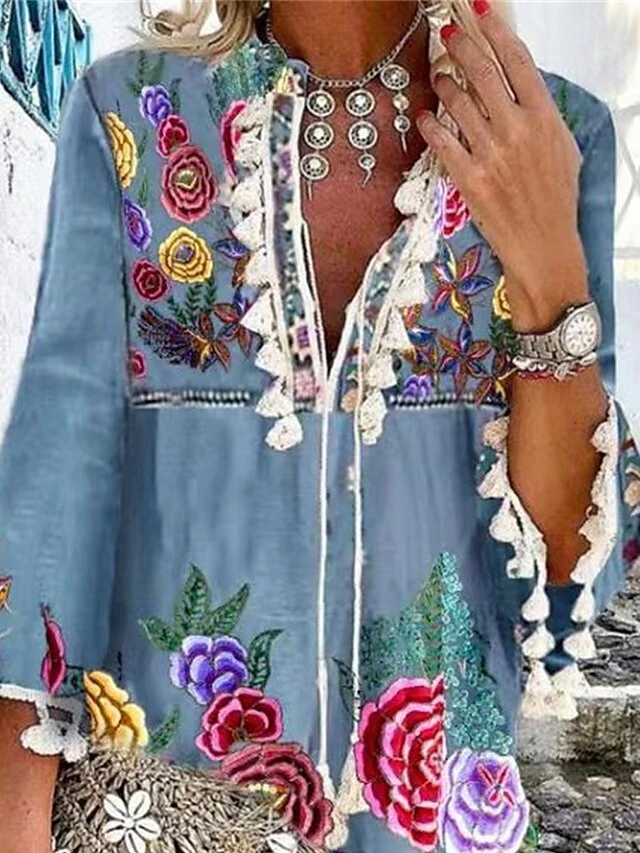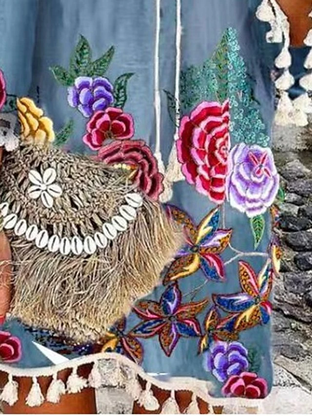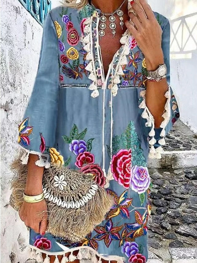 Women’s Casual Dress Print Dress Spring Dress Floral Tassel Fringe Print V Neck Mini Dress Fashion Streetwear Outdoor Street 3/4 Length Sleeve Loose Fit Sky Blue Spring Fall S M L XL XXL