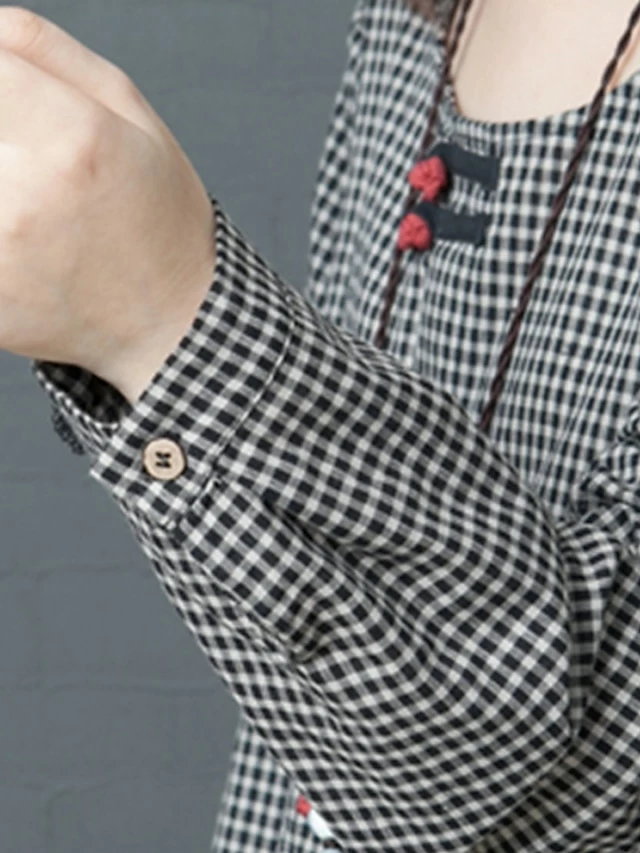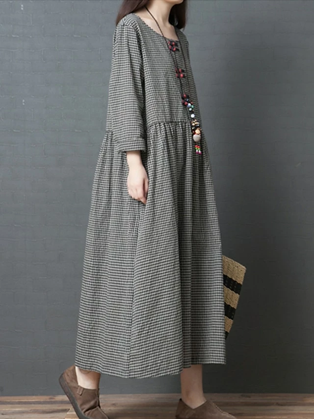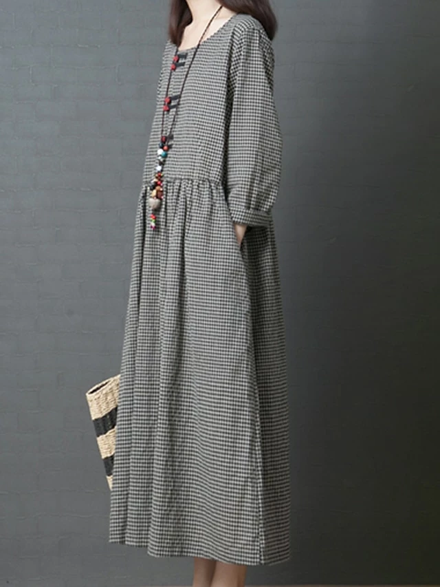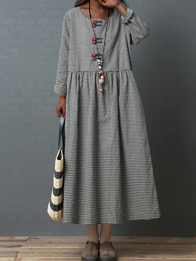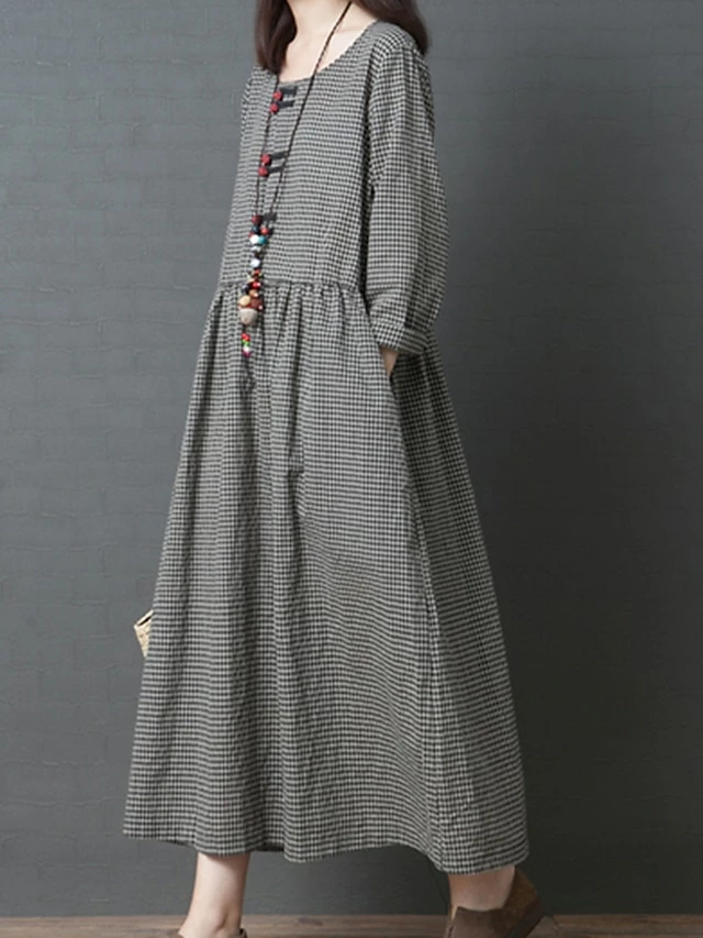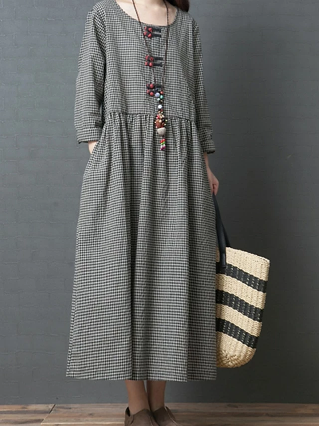 Women’s Casual Dress Swing Dress A Line Dress Long Dress Maxi Dress Cotton Basic Casual Outdoor Daily Weekend Crew Neck Pocket Long Sleeve Spring Fall Loose Fit Black Plaid M L XL XXL