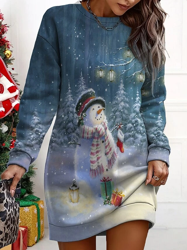 Women’s Christmas Casual Dress Sweatshirt Dress Mini Dress Warm Fashion OutdoorVacation Crew Neck Print SnowmanTree Loose Fit Red Royal Blue Blue S M L XL XXL
