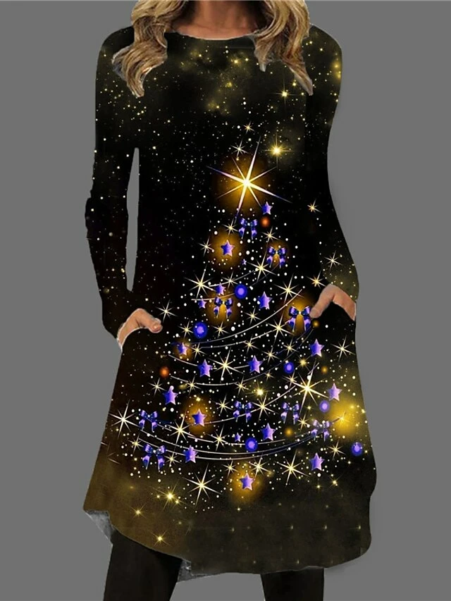 Women’s Christmas Casual Dress T Shirt Dress Tee Dress Midi Dress Black Long Sleeve Tree Pocket Print Winter Fall Crew Neck Vacation Casual Fall Dress 2022 S M L XL XXL 3XL / Winter Dress