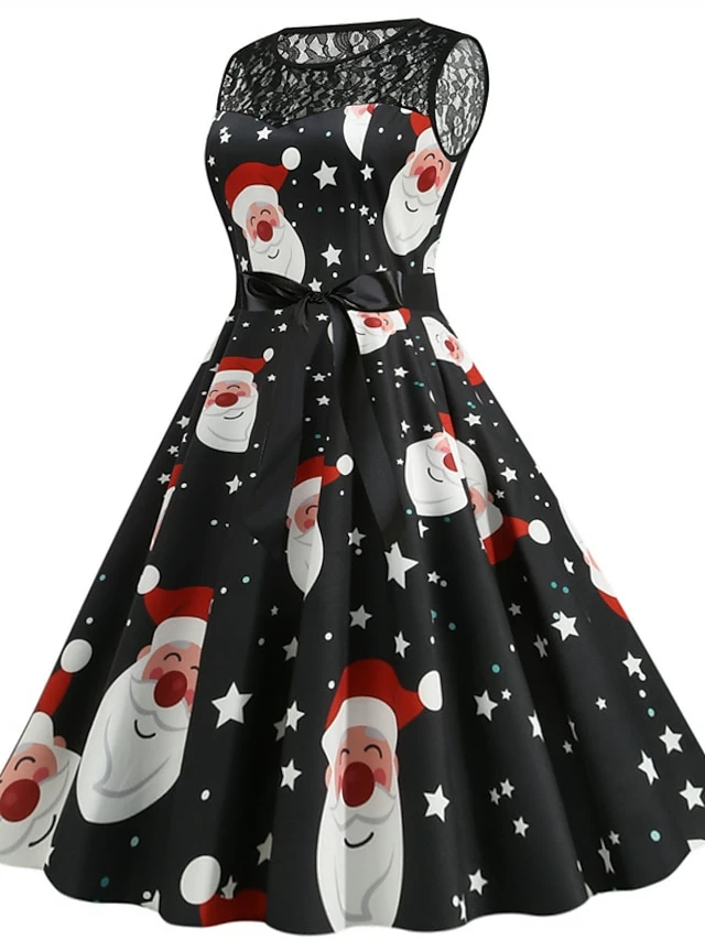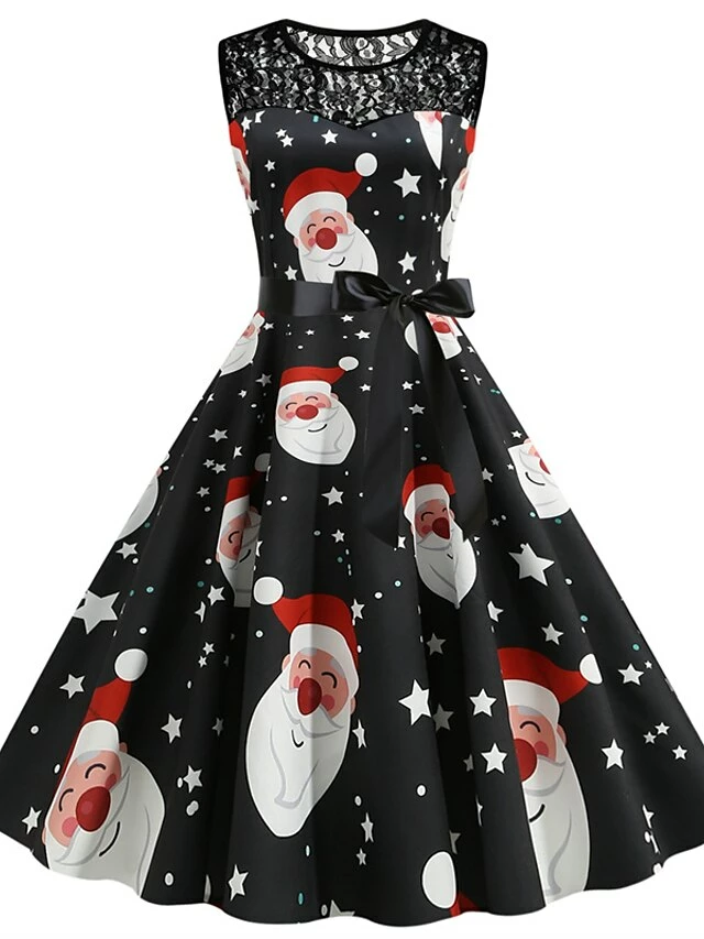 Women’s Christmas Party Dress Lace Dress Midi Dress Black Sleeveless Santa Claus Print Hat Lace Ruched Bow Winter Fall Crew Neck Vintage Party 2022 S M L XL 2XL
