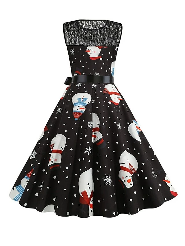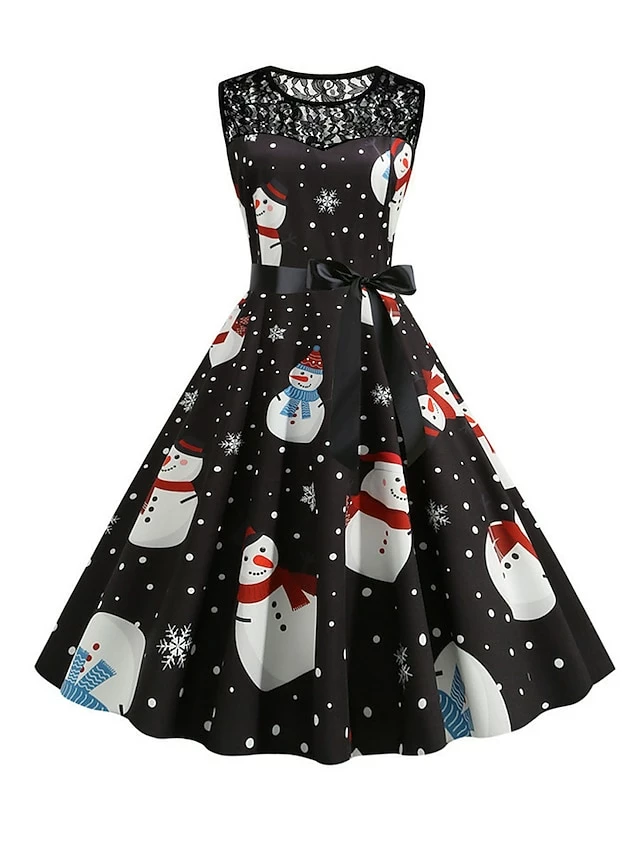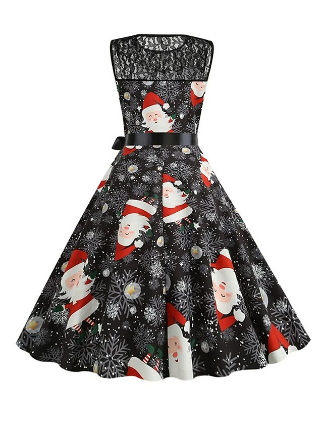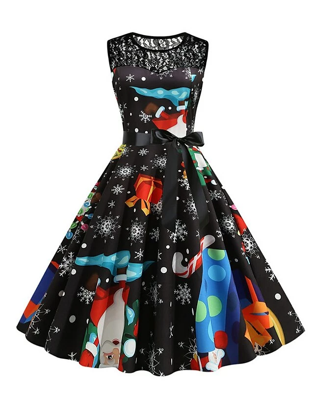Women‘s Christmas Retro 1950s Vintage Dress Midi Dress Party Patchwork Bow Santa Claus Crew Neck Sleeveless Regular Fit Fall Winter 2023 Black White S M L XL