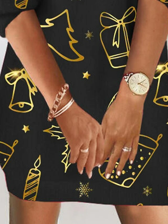 Women’s Christmas Sweatshirt Dress Shift Dress Mini Dress Gold 3/4 Length Sleeve Christmas Bell Print Winter Fall Autumn V Neck Fashion Christmas Loose Fit 2022 S M L XL XXL 3XL