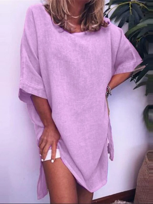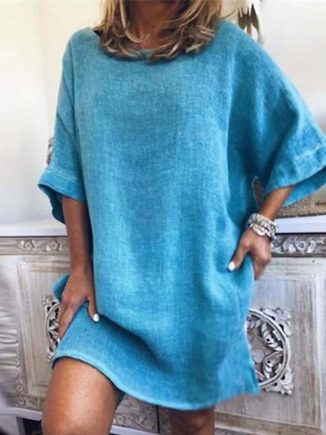 Women’s Cotton Linen Dress A Line Dress Mini Dress Cotton Blend Casual Comfort Home Daily Crew Neck Rolled Cuff Half Sleeve Summer Spring Loose Fit White Pink Blue Pure Color S M L XL 2XL