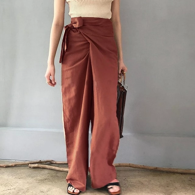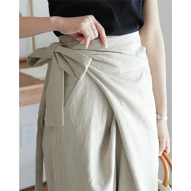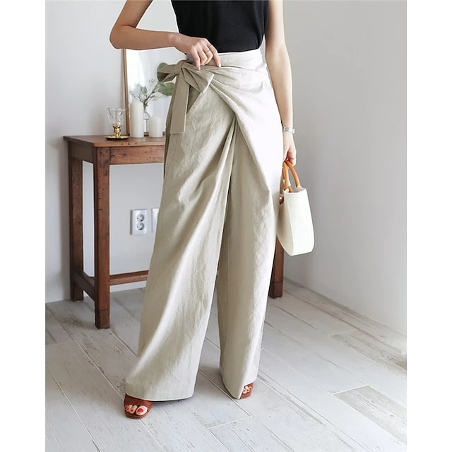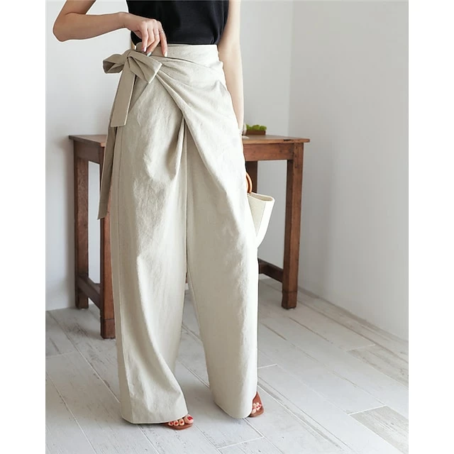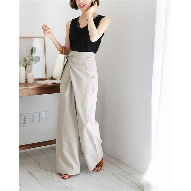 Women’s Dress Pants Culottes Wide Leg Wide Leg Full Length Faux Linen Side Pockets Baggy Mid Waist Fashion Party Casual Black Khaki M L Summer Spring &Fall