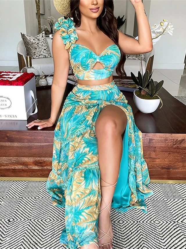 Women’s Dress Set Two Piece Dress Skirt Set Long Dress Maxi Dress Green Sleeveless Floral Backless Summer Spring One Shoulder Stylish 2023 S M L XL