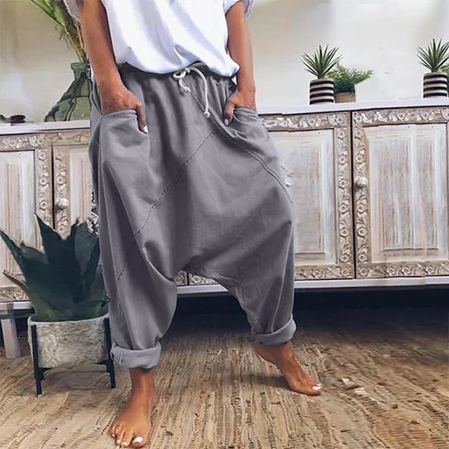 Women’s Fashion Streetwear Chinos Harem Pants Side Pockets Baggy Elastic Drawstring Design Full Length Pants Casual Weekend Micro-elastic Plain Linen / Cotton Blend Comfort Mid Waist Loose Blue Gray