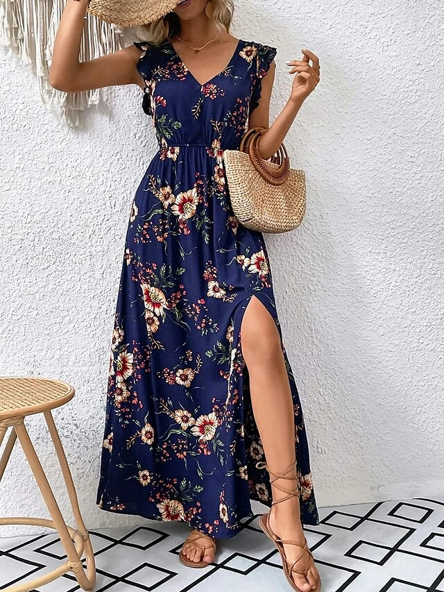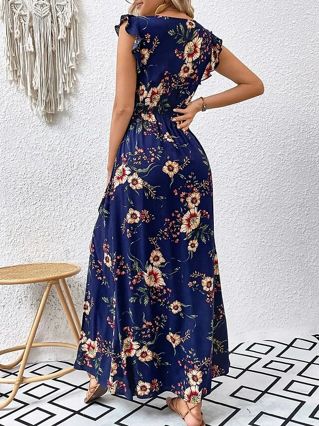 Women’s Long Dress Maxi Dress Casual Dress A Line Dress Summer Dress Floral Modern Casual Outdoor Daily Holiday Ruffle Split Short Sleeve V Neck Dress Loose Fit Dark Blue Summer Spring S M L XL XXL