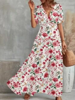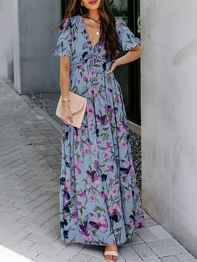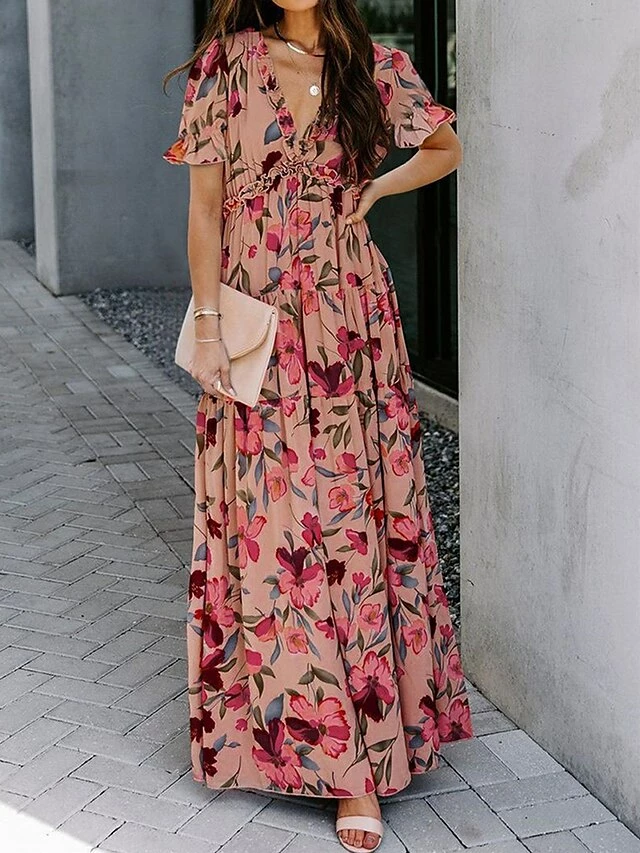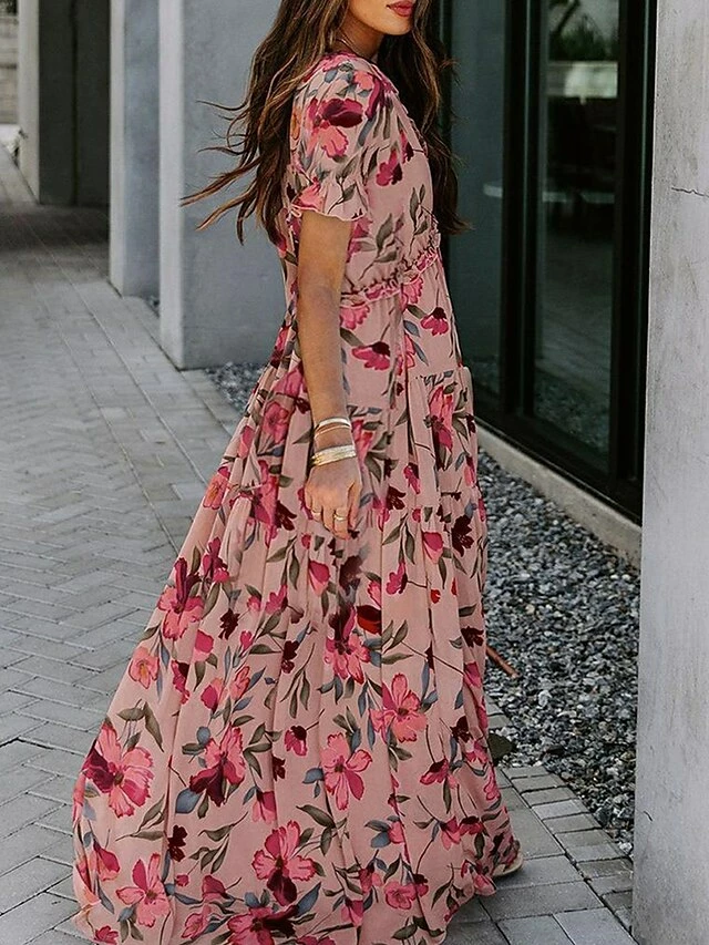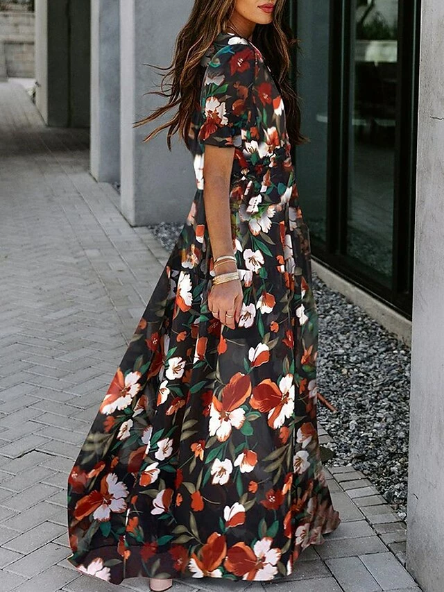 Women’s Long Dress Maxi Dress Swing Dress Print Dress Floral Streetwear Casual Outdoor Holiday Going Out Print Short Sleeve V Neck Dress Loose Fit Black White Red Spring S M L XL XXL
