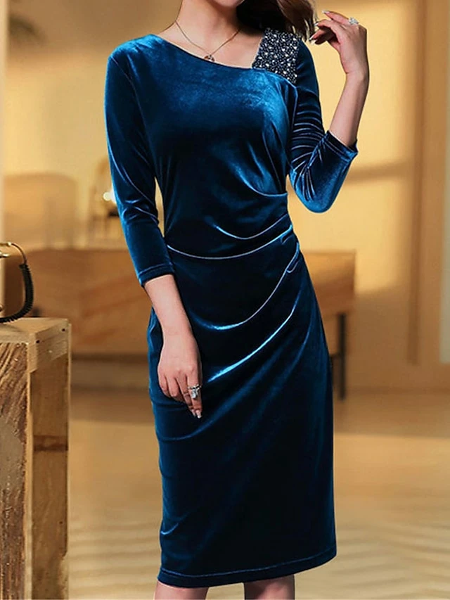 Women’s Party Dress Velvet Dress Cocktail Dress Midi Dress Blue 3/4 Length Sleeve Pure Color Ruched Spring Fall Winter V Neck Fashion Birthday Wedding Guest Fall Dress 2023 M L XL XXL 3XL 4XL