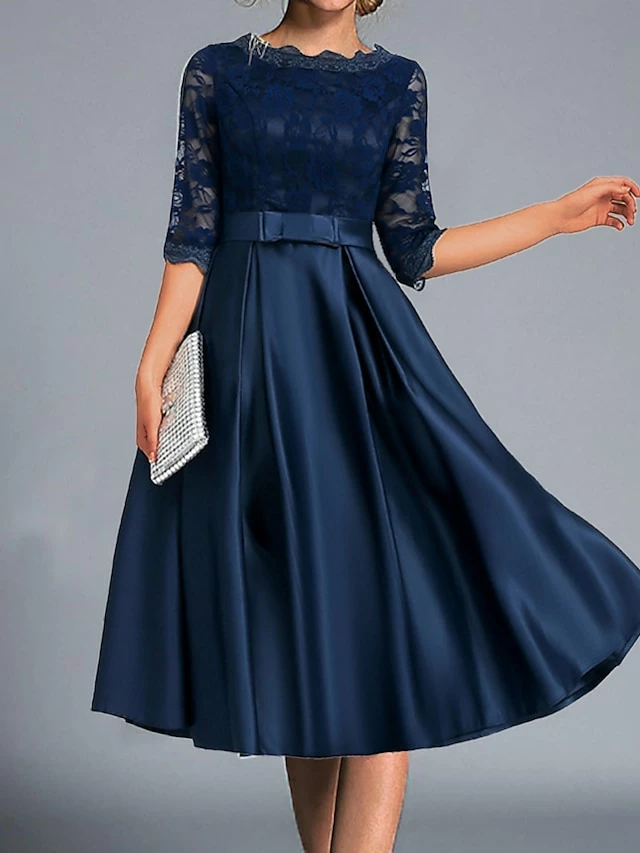 Women‘s Party Dress Wedding Guest Dress Lace Dress Swing Dress Midi Dress Navy Blue 3/4 Length Sleeve Pure Color Lace Winter Fall Spring Crew Neck Fashion Party Spring Dress 2023 XS S M L XL XXL 3XL
