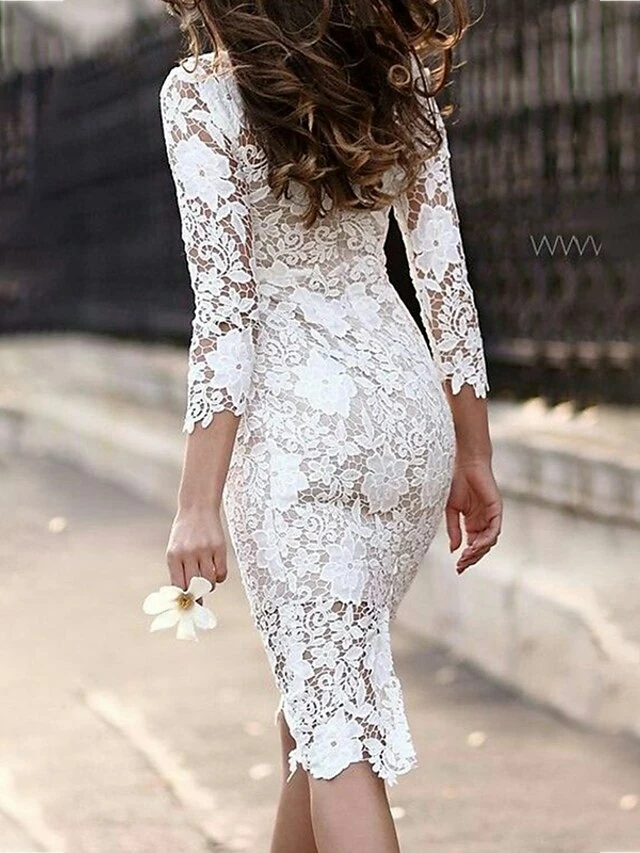 Women‘s Party Dress Wedding Guest Dress Lace Dress White Dress Knee Length Dress White 3/4 Length Sleeve Pure Color Lace Fall Spring Summer Crew Neck Party Party Vacation 2022 S M L XL
