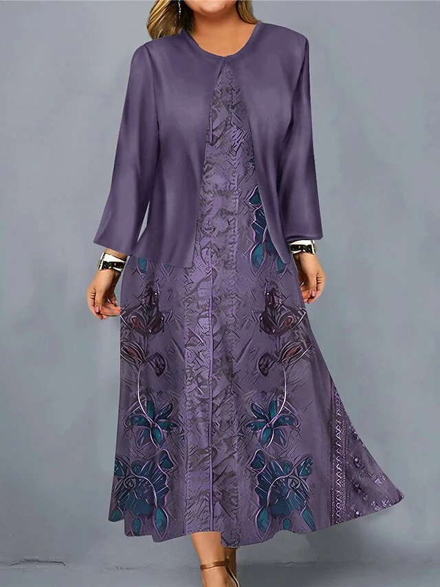 Women’s Plus Size Curve Casual Dress Dress Set Two Piece Dress Floral Midi Dress Long Sleeve Print Crew Neck Fashion Outdoor Blue Purple Fall Winter L XL XXL 3XL 4XL