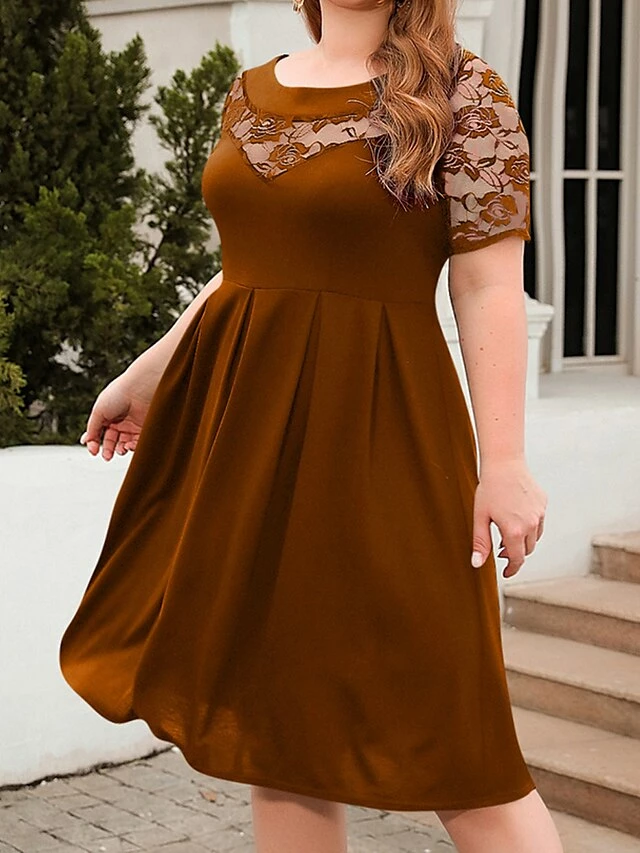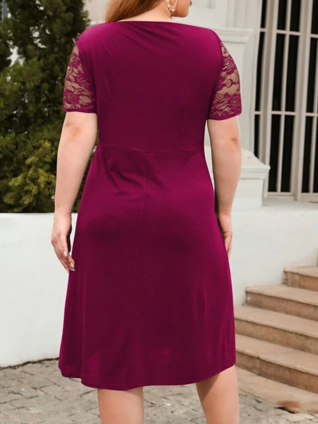 Women’s Plus Size Curve Party Dress Lace Dress Semi Formal Dress Solid Color Midi Dress Short Sleeve Lace Crew Neck Fashion Party ArmyGreen Black Fall Winter XL XXL 3XL 4XL