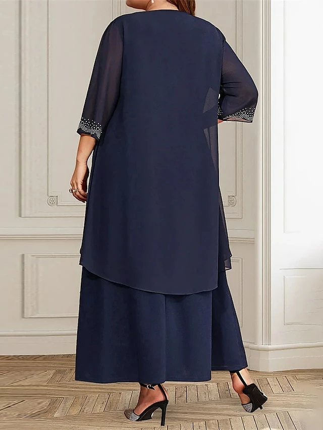 Women’s Plus Size Curve Party Dress Two Piece Dress Chiffon Dress Plain Long Dress Maxi Dress 3/4 Length Sleeve Crew Neck Fashion Party Dark Blue Fall Winter L XL XXL 3XL 4XL