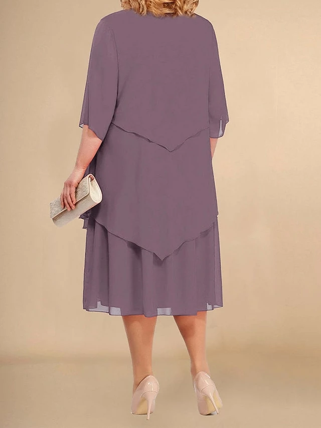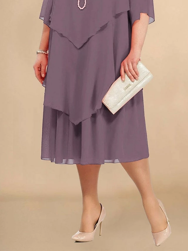 Women’s Plus Size Curve Party Dress Work Dress Wedding Guest Dress Midi Dress Light Purple Half Sleeve Pure Color Layered Spring Fall Winter Crew Neck Fashion Winter Dress Evening Party Wedding Guest