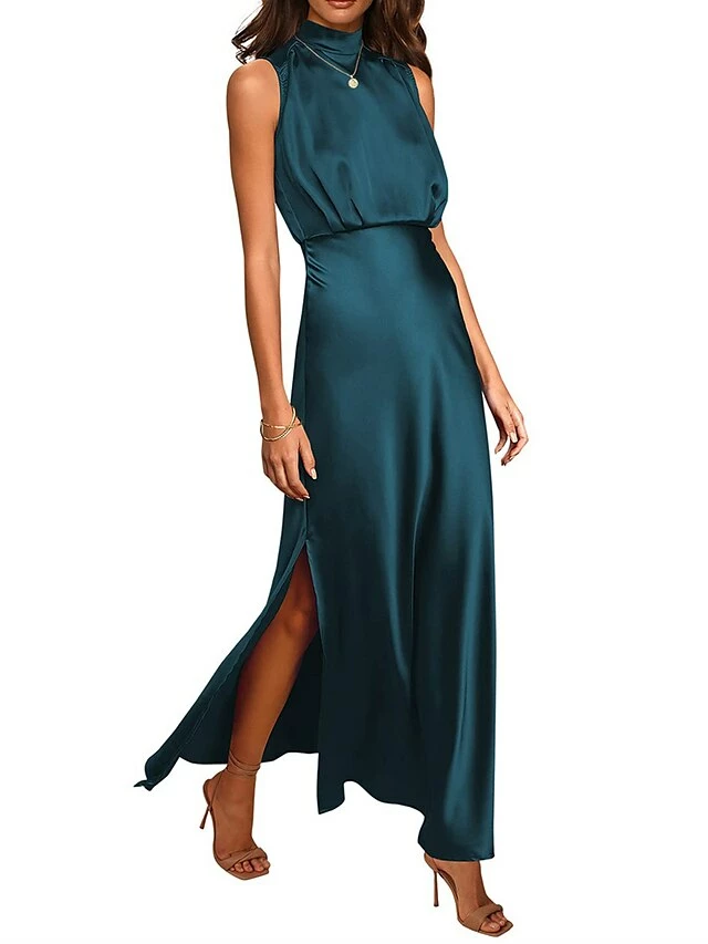 Women’s Prom Dress Party Dress Satin Dress Long Dress Maxi Dress Black Light Green Wine Sleeveless Pure Color Split Summer Spring Stand Collar Fashion Evening Party Wedding Guest Vacation Loose Fit