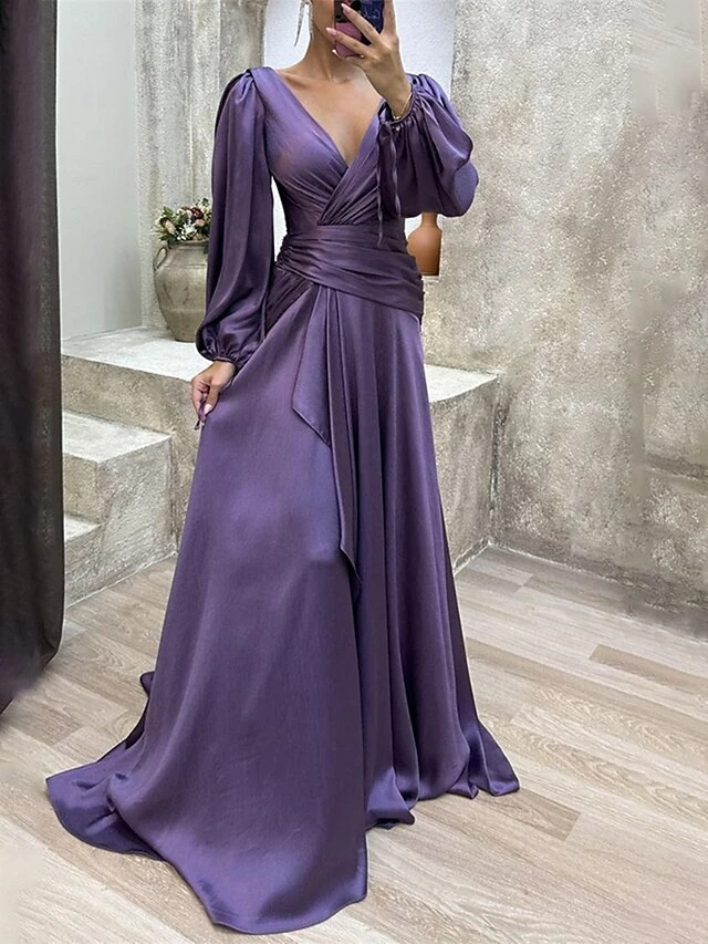 Women’s Prom Dress Party Dress Satin Dress Long Dress Maxi Dress Wine Purple Green Long Sleeve Pure Color Lace Up Fall Winter Autumn V Neck Fashion Winter Dress Evening Party Vacation 2023 S M L XL