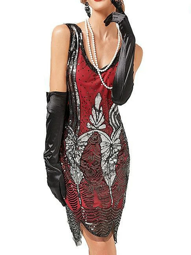 Women’s Retro 1920s Sequin Dress Midi Dress Party Halloween Sequins Patchwork Leaf Deep U Sleeveless Regular Fit Spring Fall 2023 Pink Red XS S M L