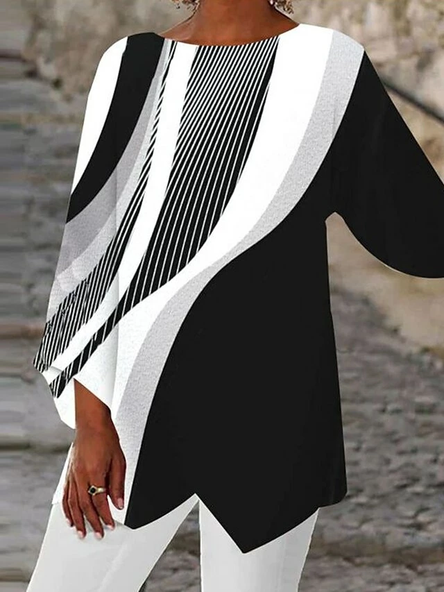 Women’s Shirt Blouse Black White Green Graphic Abstract Asymmetric Print Long Sleeve Casual Basic Round Neck Regular Fit Spring Fall