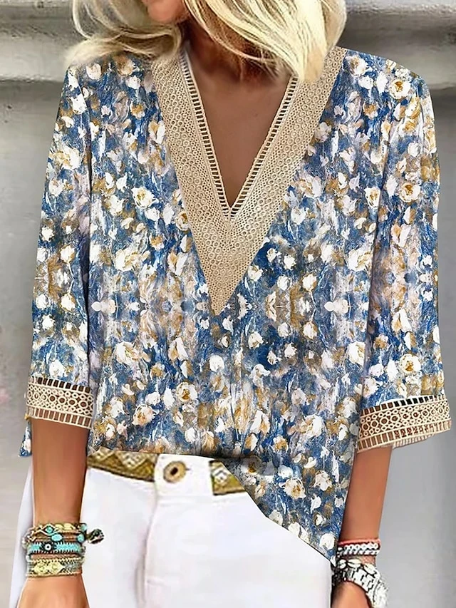 Women’s Shirt Blouse Blue Floral Lace Trims Print 3/4 Length Sleeve Casual Holiday Streetwear V Neck Regular Fit Floral