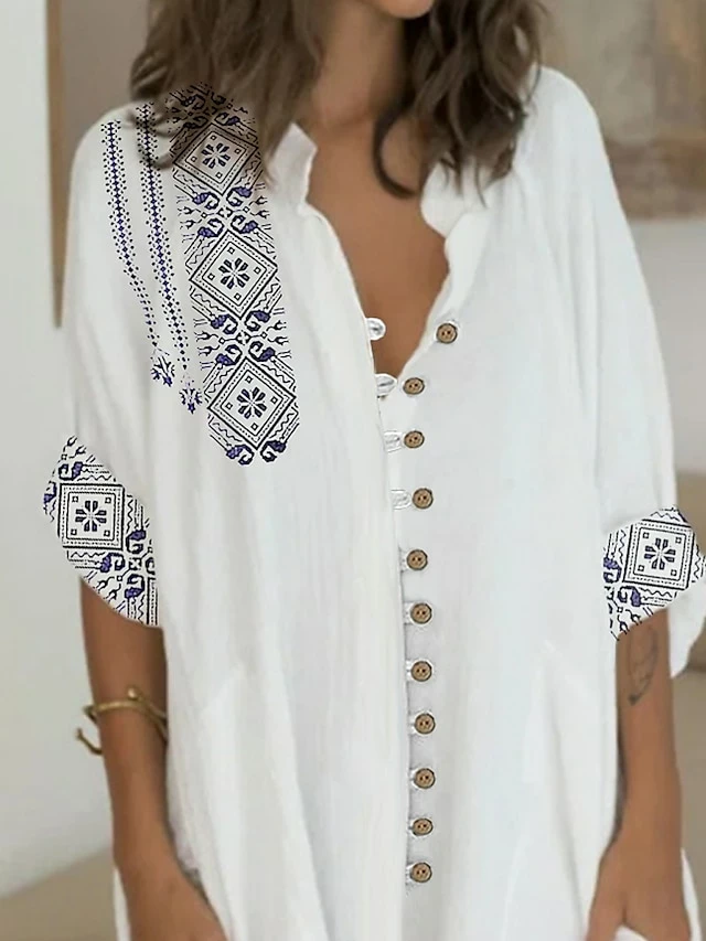 Women’s Shirt Dress Casual Dress Cotton Dress Mini Dress Cotton Blend Ethnic Style Modern Outdoor Daily Shirt Collar Button Pocket Short Sleeve Summer Spring 2023 Loose Fit White Geometric Tribal S M