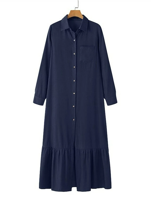 Women’s Shirt Dress Casual Dress Maxi Long Dress Outdoor Daily Cotton Fashion Casual Shirt Collar Ruffle Button Long Sleeve Summer Spring Fall 2023 Regular Fit Navy Blue Blue Plain S M L XL XXL
