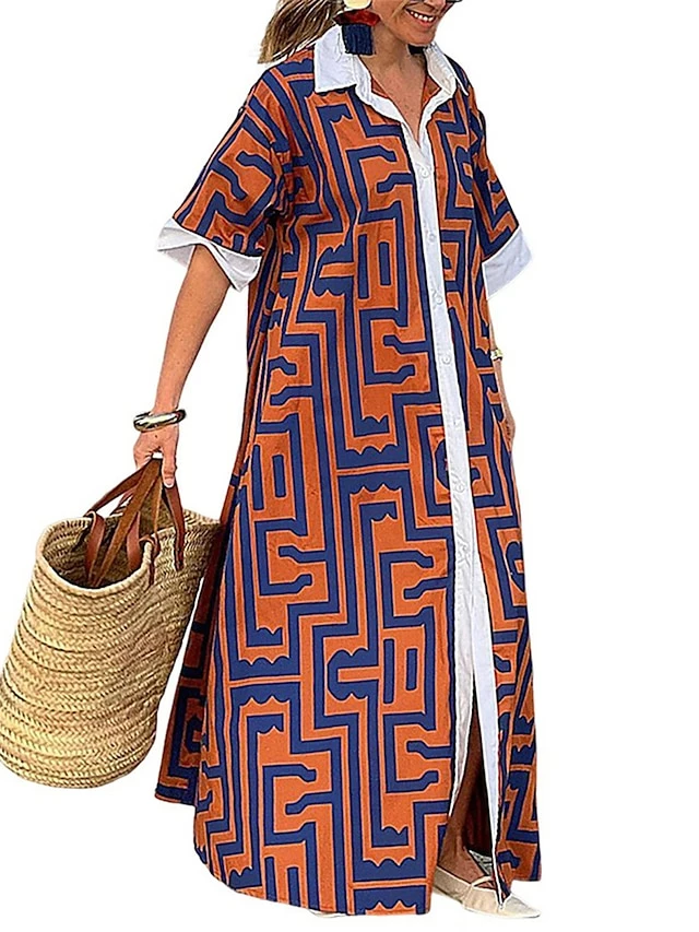 Women’s Shirt Dress Casual Dress Maxi Long Dress Outdoor Daily Vacation Polyester Fashion Basic Shirt Collar Button Split Short Sleeve Summer Spring 2023 Loose Fit Orange Geometric S M L XL