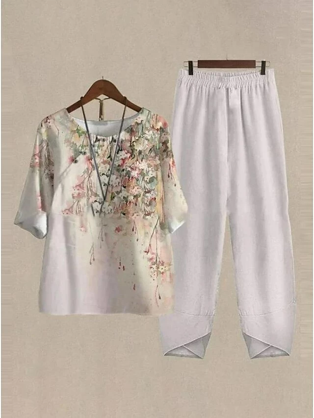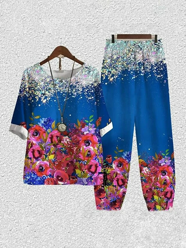 Women’s Shirt Pants Sets Black Yellow Pink Floral Plant Print Holiday Weekend Daily Basic Neon & Bright Round Neck Regular Fit Fall & Winter