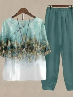Women’s Shirt Pants Sets Pink Purple Green Graphic Print Holiday Weekend Daily Basic Round Neck Regular Fit Fall & Winter