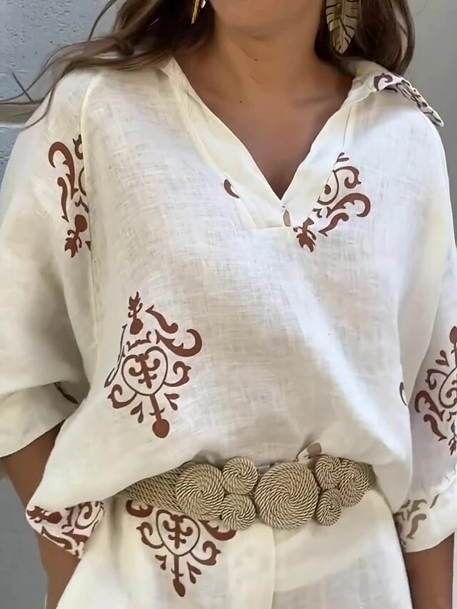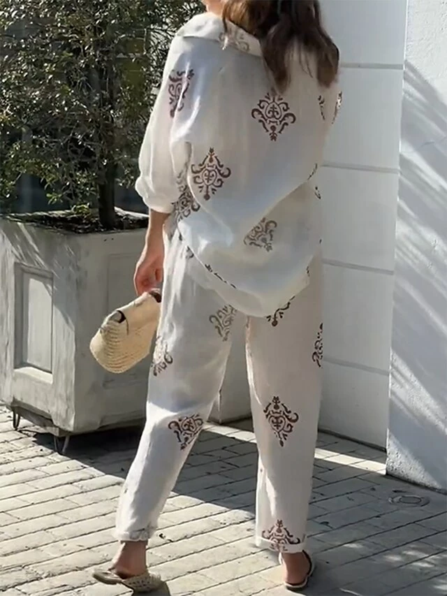 Women’s Shirt Pants Sets White Graphic Print Long Sleeve Work Daily Fashion Shirt Collar Regular Fit Spring &Fall