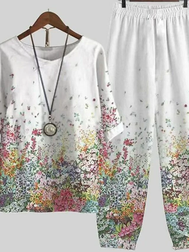 Women’s Shirt Pants Sets Yellow Pink Blue Floral Print Half Sleeve Holiday Weekend Basic Round Neck Regular Fit Fall & Winter