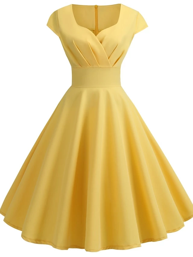 Women’s Swing Dress Vintage Tea Dresses Midi Dress Black Yellow Pink Short Sleeve Pure Color Ruched Spring Summer Crew Neck Vintage Daily Weekend Slim S M L XL XXL