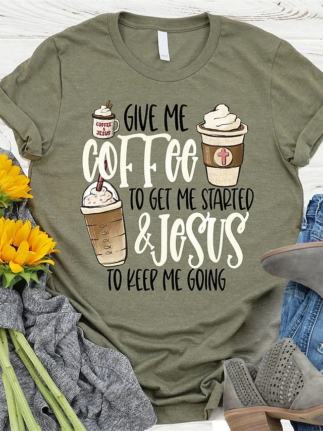 Women’s T Shirt Tee Army Green Graphic Letter Print Short Sleeve Daily Weekend Basic Round Neck Regular Fit Painting