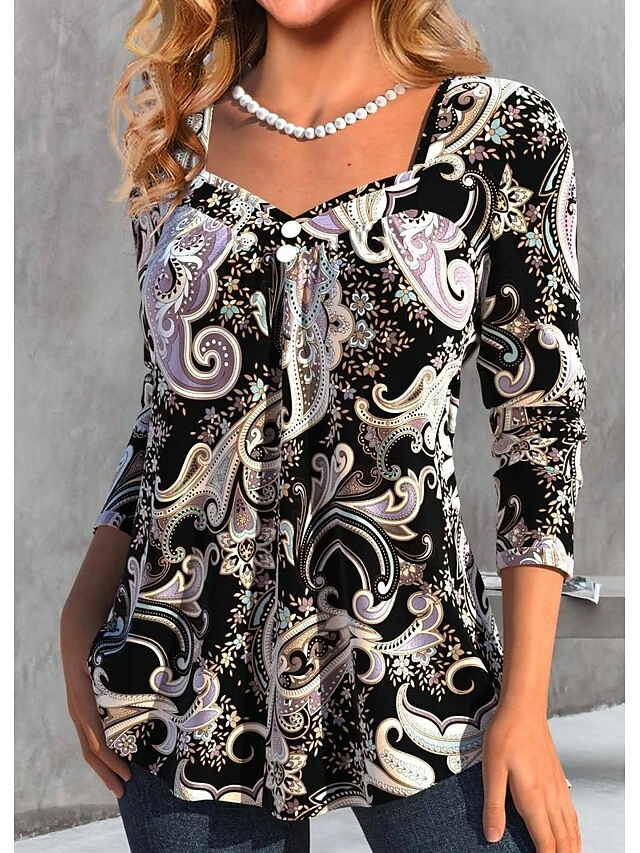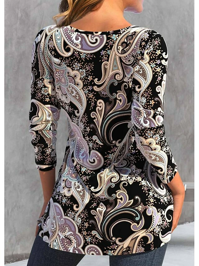 Women’s T Shirt Tee Black Paisley Button Print Long Sleeve Daily Weekend Fashion V Neck Regular Fit Painting Spring &Fall