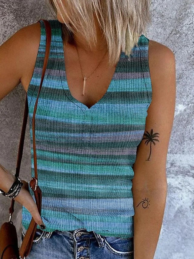 Women’s Tank Top Going Out Tops Pink Blue Purple Striped Button Print Sleeveless Casual Basic V Neck Regular Fit
