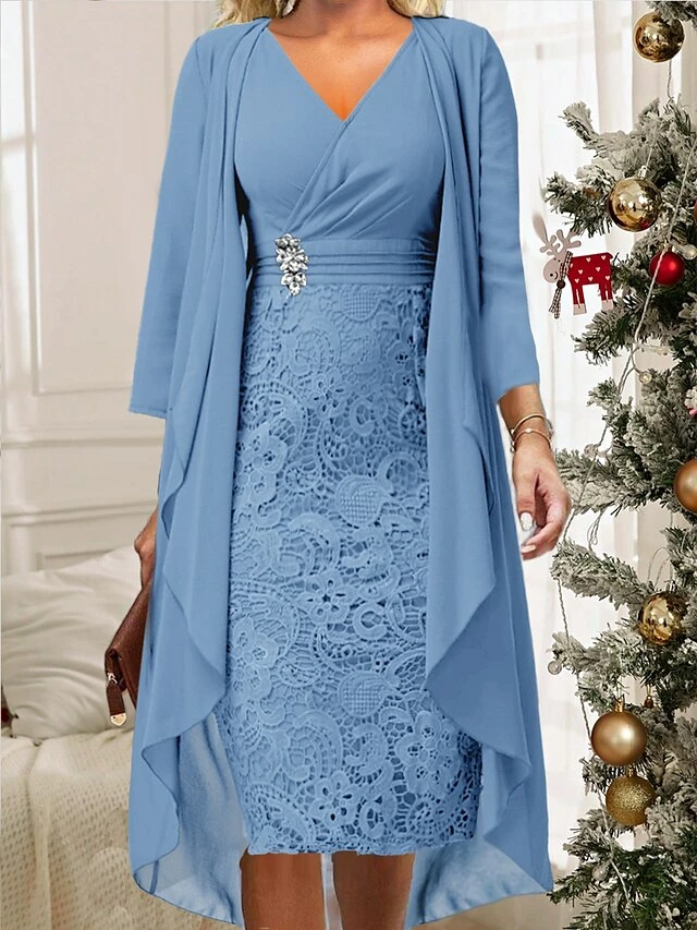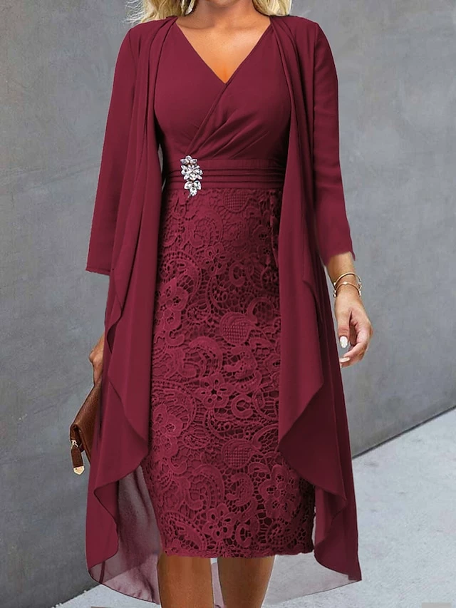Women’s Two Piece Dress Set Casual Dress Lace Dress Outdoor Daily Fashion Elegant Lace Patchwork Midi Dress V Neck Long Sleeve Plain Regular Fit Wine Blue Sky Blue Fall Winter S M L XL XXL