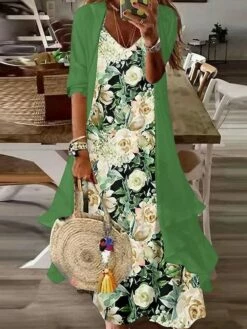Women’s Two Piece Dress Set Casual Dress Print Dress Outdoor Daily Fashion Streetwear Print Long Dress Maxi Dress V Neck Half Sleeve Floral Regular Fit Green Summer Spring S M L XL XXL