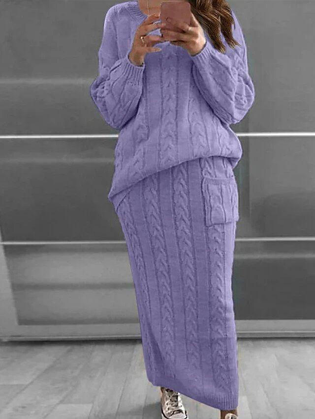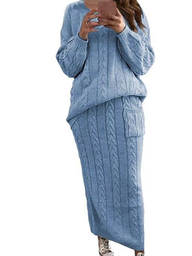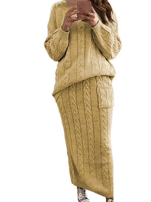 Women’s Two Piece Dress Set Casual Dress Skirt Set Daily Holiday Fashion Streetwear Pocket Ribbed Long Dress Maxi Dress Crew Neck Long Sleeve Plain Loose Fit Black Yellow Wine Fall Winter S M L XL XXL