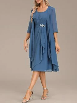 Women’s Two Piece Dress Set Party Dress Chiffon Dress Party Wedding Guest Fashion Elegant Ruffle Midi Dress Crew Neck 3/4 Length Sleeve Plain Loose Fit Blue Fall Winter S M L XL XXL
